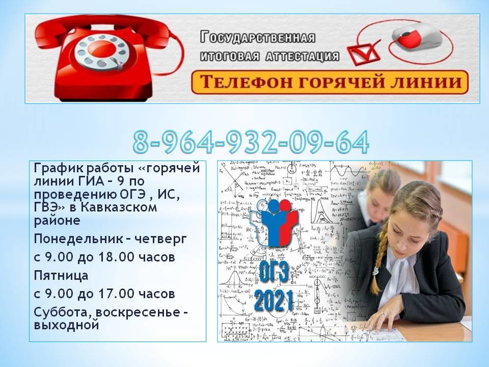622.88 КБ Телефоны «горячей линии»в Краснодарском крае Просмотр Скачать 32.5 КБ Информация о работе телефонов «горячей линии» по вопросам организации и проведения государственной итоговой аттестации по программам основного общего образования в форме ОГЭ, ГВЭ в 2019-2020 учебном году Скачать 32.5 КБ Информация о работе телефонов «горячей линии» по вопросам организации и проведения итогового собеседования по русскому языку в 2019-2020 учебном году Скачать