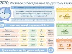 Итоговое собеседование проводится в образовательных организациях, в которых участники итогового собеседования осваивают образовательные программы основного общего образования. Экстерны проходят итоговое собеседование в образовательных организациях, выбранных экстернами для прохождения ГИА. Итоговое собеседование начинается в 09.00 часов. Продолжительность выполнения работы каждым участником итогового собеседования составляет 15-16 минут. В продолжительность итогового собеседования не включается время, отведенное на подготовительные мероприятия.