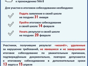 Итоговое собеседование проводится во вторую среду февраля. Дополнительные сроки проведения итогового собеседования — вторая рабочая среда марта и третий понедельник апреля.