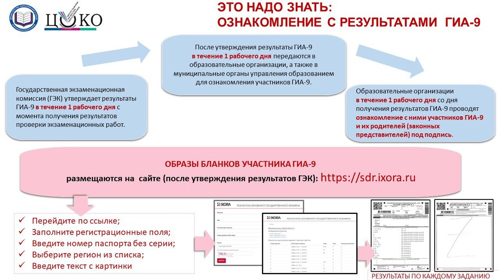 Информирование обучающихся о результатах экзаменов осуществляется в соответствии с Порядком проведения государственной итоговой аттестации по образовательным программам основного общего образования (далее – ГИА), утвержденным приказом Министерства просвещения Российской Федерации и Федеральной службы по надзору в сфере образования и науки от 4 апреля 2023 г. № 232/551.