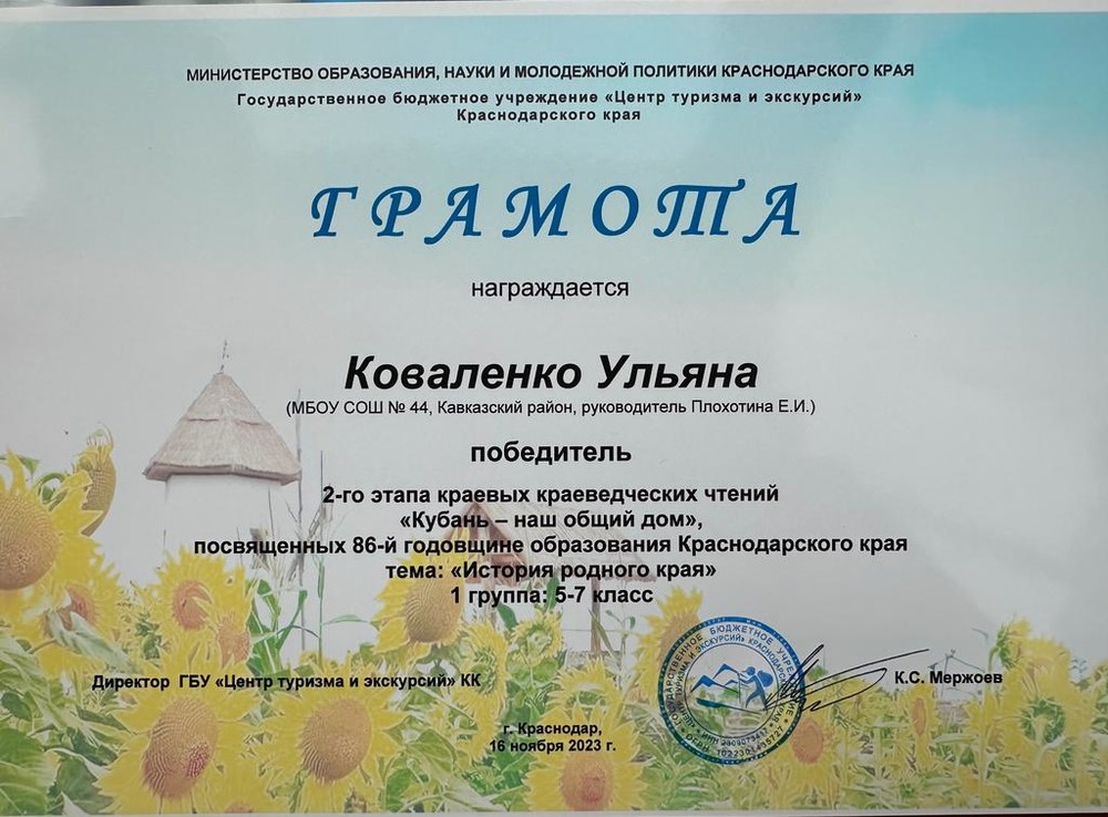 Коваленко Ульяна, учащаяся 6 класса МБОУ СОШ №44 имени П.Г.Поветкина г.Кропоткин стала победителем 2-го этапа краевых краеведческих чтений «Кубань – наш общий дом», посвященных 86-годовщине образования Краснодарского края.